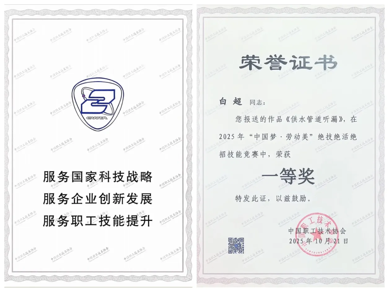 近日,由中國職工技術協會聯合陜西省總工會、西安市總工會等單位共同組織開展的2025 年“中國夢·勞動美”第一屆職工“三絕”(絕招絕技絕活)線上技能競賽圓滿收官。凈水處理公司清遠中水公司職工白超的《供水管道聽漏》絕活視頻展示,通過線上推薦、專家評審等環節,在全國300余部參賽作品中脫穎而出,榮獲本次競賽個人一等獎!
